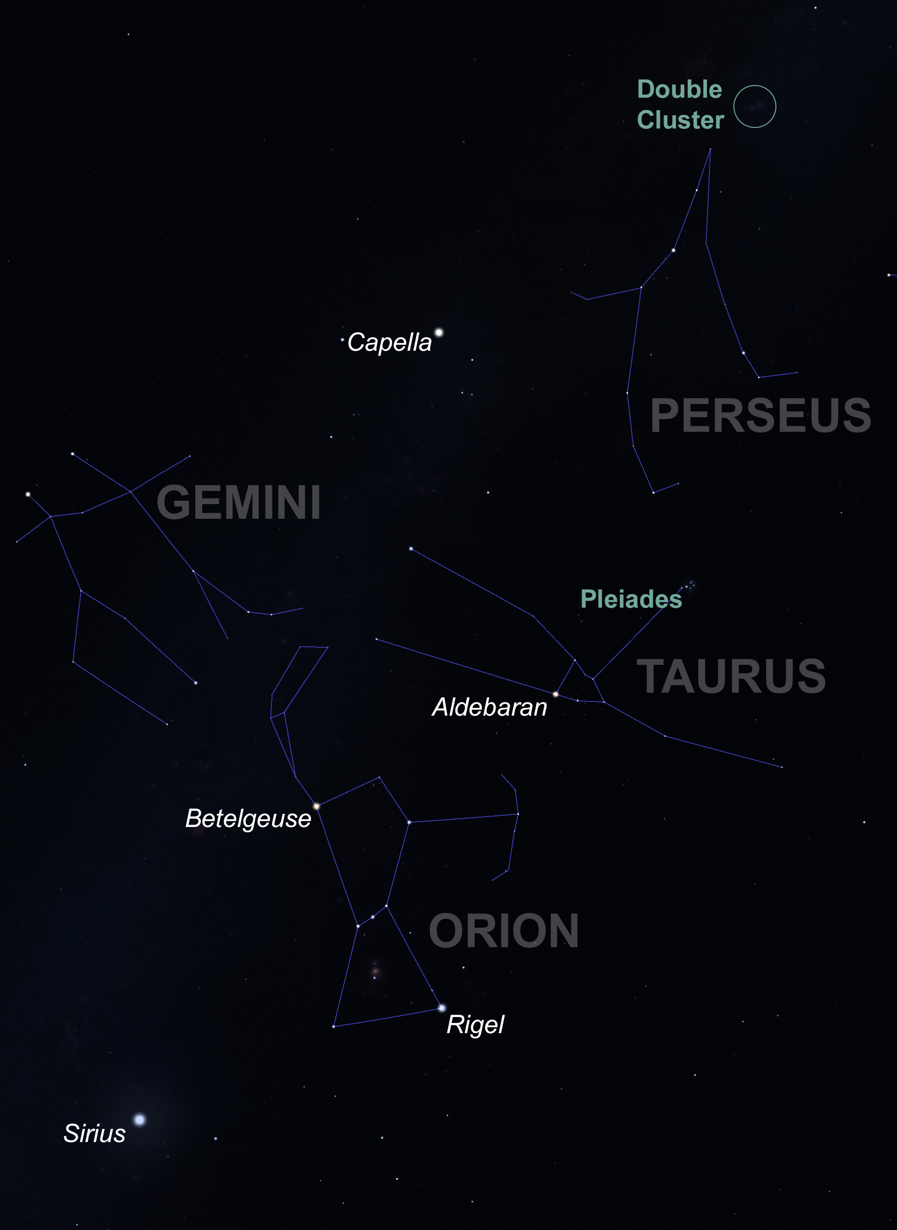 Overhead during frigid January evenings lie quite a few notable constellations of Greek myth. King Cepheus and Queen Cassiopeia, rulers of Aethiopia, remain high in the northern sky as they as they march around the North Star. The winged horse Pegasus and princess Andromeda gradually move more westward with each passing night, and trailing them is the heroic Perseus, slayer of the gorgon Medusa. All these constellations hold a treasure trove of deep sky wonders, and aside from the bright Andromeda Galaxy, most require a telescope to even catch a faint glimpse; however, Perseus offers us a sight that only requires good eyesight and dark skies – the Double Cluster.
